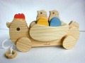 ★受注生産(納期3ヶ月)。13個のパーツは簡単に取り外しでき、積木や転がし遊びや、親鳥とヒヨコで物語的に楽しく遊びながら想像性を育てる木のおもちゃ。遊びの終わりには、元どおりに組立てる事で片付けかたを学べます。遊びながらやさしい木の音が感じられます。安全なデザイン(形状、丸面取り仕上げ、パーツサイズ、引きヒモの長さ)安全な植物性塗装を使用しています。サイズ W36cm D11cm H19cm 松材 [説明書付き]
