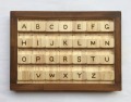 表が大文字、裏が小文字、指でつまんで簡単に取り出したり組み込んだりできるブロックタイプのパズル、文字を読みながら一つ一つ取り出したり、全部取り出してパズル式に一つ一つ組み込んだり、遊びながら文字をおぼえます。文字は一つ一つ手書きの素朴な焼文字です。安全な植物性塗装を使用しています。サイズ W25cm D2cm H18cm 松材 [説明書付き]