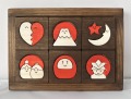 縁起物の飾り玩具(パズル式)無料サービスの枠付(枠のみは非売)、縁起物の順番を入れ替えたり、取り出して干支の枠を台にして一個ずつでも飾れます。紅白の色は日本の縁起色です。一年中飾れます。種類(ハート・富士山・星と月・おひな様・だるま・かぶと)W25cm D3cm H18cm 松材・植物性塗料使用